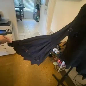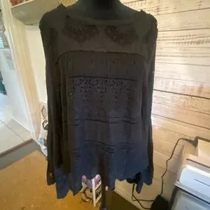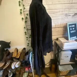 Chic black lace blouse with intricate patterns. Flowy sleeves add elegance.