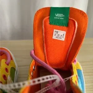 Bright high-tops with a playful mix of colors. Features orange, blue, and green panels. Pink laces for added flair. Perfect for your little one. Zipper backs assist with easy on and off during those hurried mornings.