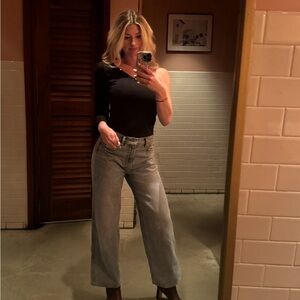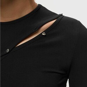 Black cutout convertible long sleeve top. Perfect for any occasion, this top offers a sleek and modern look. Can remove a sleeve for a one-shoulder look. Very versatile top, great for fall and winter date nights, casual day outings, or the office. Lightly worn, was a bit too snug for my larger chest.