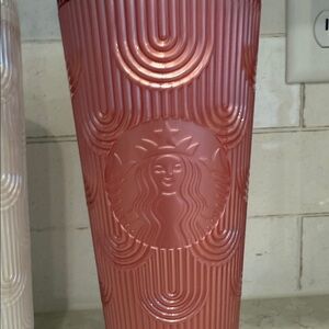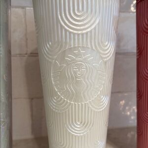 Set of three stylish Starbucks tumblers. Features iridescent, white, and red designs. Ideal for any beverage. 24oz. Green never used, white & pink in perfect condition. $15 each