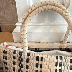 This is a very pretty cream , Navy and light blue leather woven Handbag tote