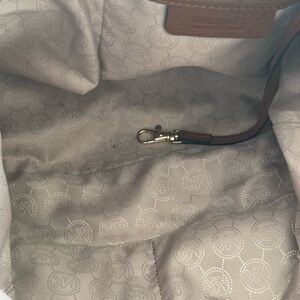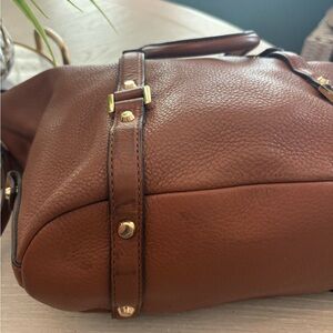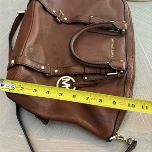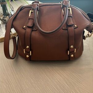 Chic Michael Kors satchel in tan leather. Features gold-tone hardware and adjustable strap. Perfect for everyday elegance.