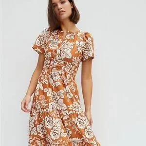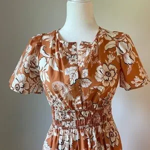 By Anthropologie- Elegant terracotta maxi dress with floral pattern. Features short sleeves and a gathered waist. Perfect for any occasion.