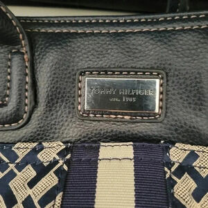 Navy Blue Jacguard TH Logo Purse, Pocket on Outside, 2 Zipper Pockets on the inside. 9.5in H 10in W