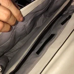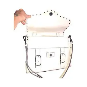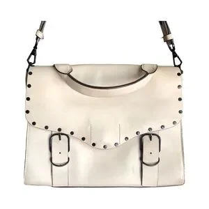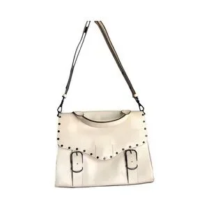 Chic cream satchel with stud accents. Features dual buckle design and adjustable strap. Perfect for stylish outings.