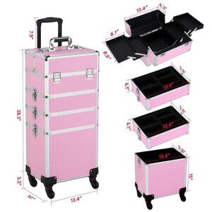 New 4-in-1 Pink Rolling Makeup Train Case, Pro Trolley Organizer with Wheels