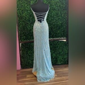 Dazzle in this light blue sequin dress. Features a stunning sweetheart neckline and elegant slit. Perfect for prom night.