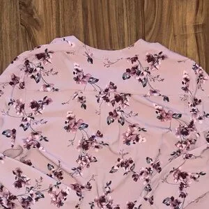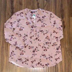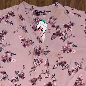 Elegant blouse with floral design. Features a soft mauve color. Ideal for stylish outings. 100% polyester. Never been worn.