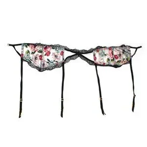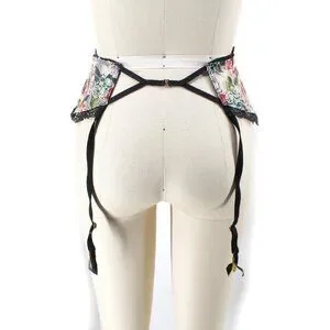 This semi-sheer mesh garter belt features vintage-inspired floral panels with peekaboo cut-outs, trimmed in delicate black lace and finished with gold-tone hardware. It's playful, romantic, and unapologetically extra.