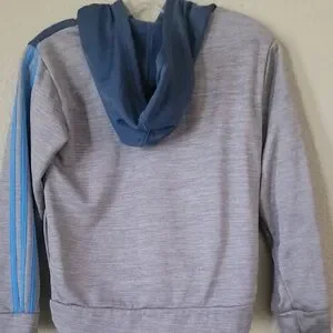 Stylish Adidas hoodie for kids. Features a bold blue and gray color scheme. Ideal for casual wear. *Stain on sleeves. See picture*