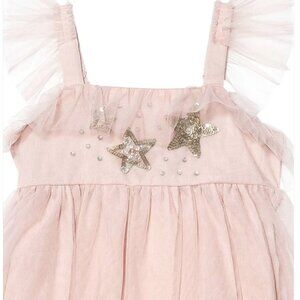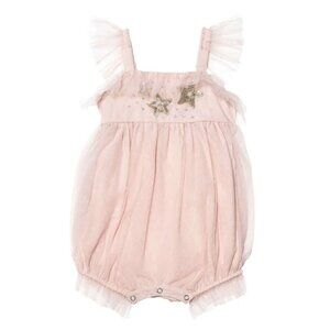 This Sweet Tulle Overlay Romper by Tutu Du Monde is most PRECIOUS!! Collect special treasures in the Bryony Tulle Onesie in Ballet Slipper, a soft Blush Pink. The bodice features delicate sequins in the shape of stars. Soft tulle ruffles adorn the neckline and shoulders. There is a snap inseam for easy changes and elastic leg openings for comfort. Elastic smocking in back for comfort and no-gap fit. The perfect little party outfit. Dressy enough for baby wedding guests. Super adorable! Last of stock- Hard to find item!!