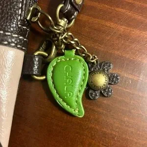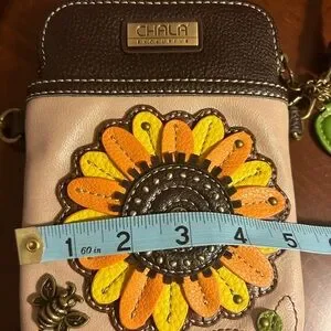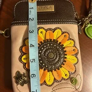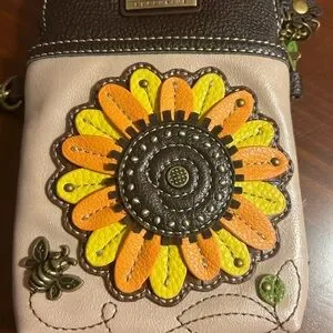 Chala crossbody bag with vibrant sunflower design. Features orange and brown accents. Perfect for essentials.