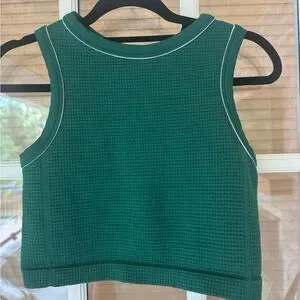 Green textured top by All in Motion. Seamless muscle tank top made from recycled polyester-spandex blend fabric is designed to move and stretch with you. Fashioned in a crew neckline with super-crop length. Pullover style allows for easy on and off, and the sleeveless design and piping complete the sporty look.