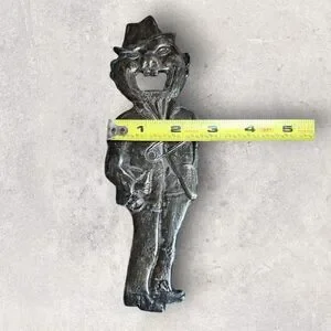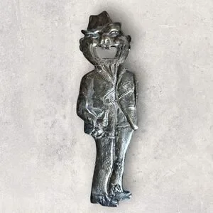 This quirky antique bottle opener is a true conversation starter! Dating to the 1930s, its cast in solid brass and depicts a classic tramp or hobo figure, full of whimsical details. Heavy in hand and double sided, this piece is as functional as it is collectible. Perfect for a vintage barware collection or as a unique gift for the collector who has everything.