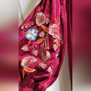 Beautiful balloon sleeve floral embroidered velvet tunic dress by Aofur. Stunning with a tie at neck in red crushed velvet serving a boho aesthetic.