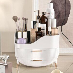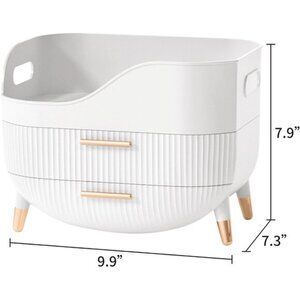 * Appearance and size: 9.9”L×7.3”W×7.9”H,Large capacity cosmetic organizer with 2 drawers and top compartment,can organize tall bottles of skincare and cosmetics,Household containers for storing and organizing makeup.