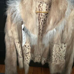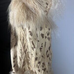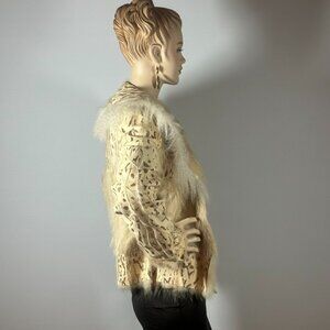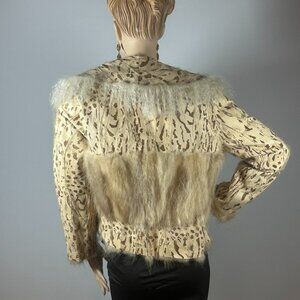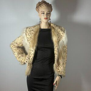 Fierce elegance never goes out of style. This vintage cropped fur jacket blends wild luxury with a soft feminine silhouette. The body features a striking leopard stencil print, framed with creamy white and honey-toned fringe fur accents that cascade down the front and sleeves.