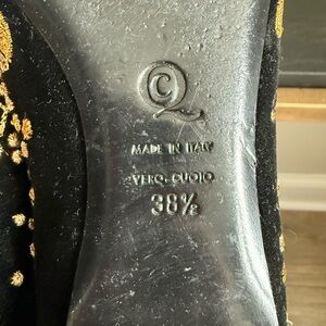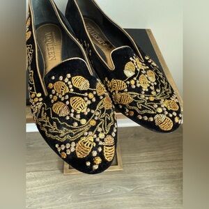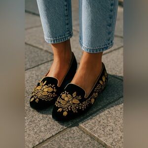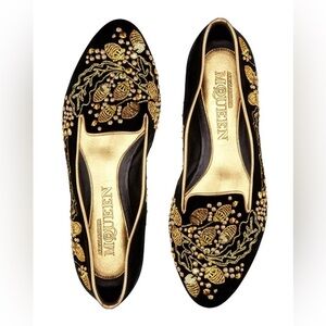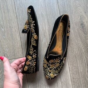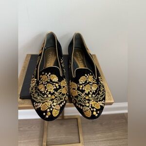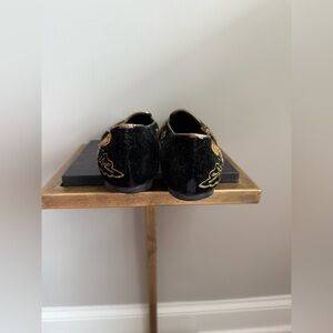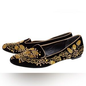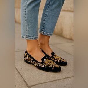 Elegant women's flats featuring intricate gold acorn embroidery on a classic black base. Perfect for adding a touch of luxury to any outfit. EUC! Authentic!