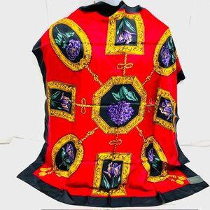 This Rose City 100% Silk Satin Large 34"x34"  Black Red Green Gold Purple Floral scarf is a stunning accessory for women. The multicolor floral pattern and shawl/wrap style make it a versatile piece for various seasons. With accents like the brand logo and a vintage feel, this scarf is perfect for those who appreciate nature.