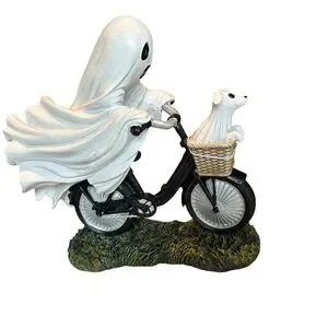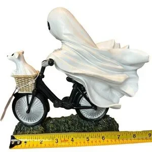 New with tags charming ghost and dog figurine on a bicycle. Features a whimsical design in white and black. Perfect for adding a playful touch to your home decor.