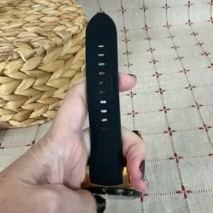 50mm. Stainless steel case. 100m water resistant. Black silicone strap with buckle closure
