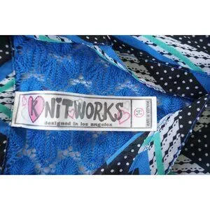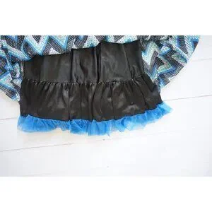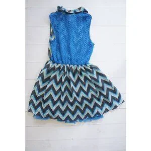 This sleeveless Knitworks dress features a vibrant chevron pattern with a contrasting lace back and hem ruffle. Designed in Los Angeles and crafted in Vietnam, it combines style and comfort for young fashion enthusiasts.