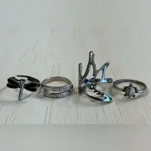 Hawaii-Inspired Silver Ring Set β bird, turtle, dragonfly, aloha