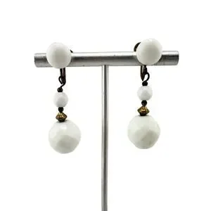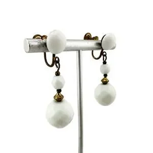 Vintage Milk Glass Gold Tone Beaded Dangle Drop Screw Back 1.75" Earrings