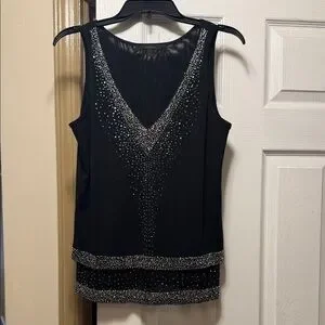 Chic black tank top with shimmering silver embellishments. Ideal for evening wear. Stylish and versatile.