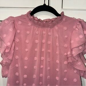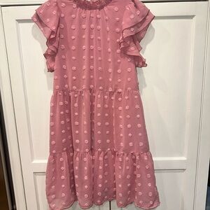 Charming pink dress with ruffle sleeves. Features a textured polka dot pattern. Perfect for casual outings.