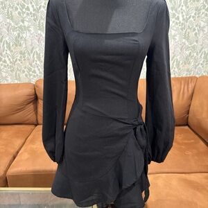 Chic and flattering long sleeve mini dress featuring a square neckline, puff sleeves, ruffle hem, and a side tie wrap detail. Fitted in the waist and flowy at the hem — perfect for dinner dates, parties, or seasonal events.