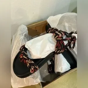 Features: Slip-on style, printed cotton straps, self-tie wrap closure, knotted accents, contoured footbed, flat sole