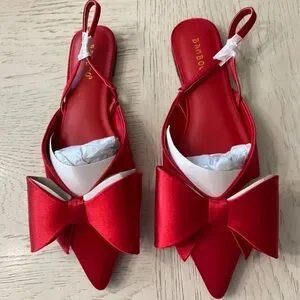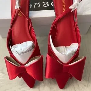 Elegant Bamboo red satin slingback flats with a striking bow. Perfect for a chic look. Brand new in box.