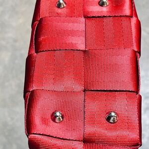 Bold cherry red tote with a unique woven design. Perfect for adding flair to any outfit. Durable and stylish. In great condition. Outside is spotless. Small dirt spot or stain on the inside bottom corner. It’s hard to see.
