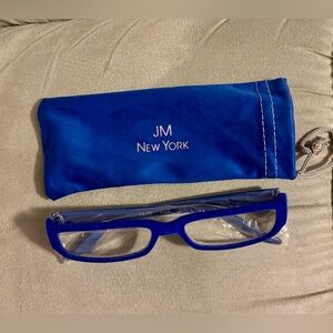 JOY MANGANO +3.0 Readers with Spring Temple. Suede like material on front around lens and sides are plastic with jeweled design. Pouch/case doubles as cleaning cloth. Color: vibrant blue.