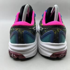 Vibrant multi-color upper with pink lining, blue laces, and patterned mesh