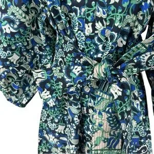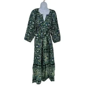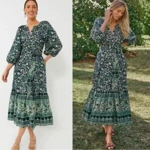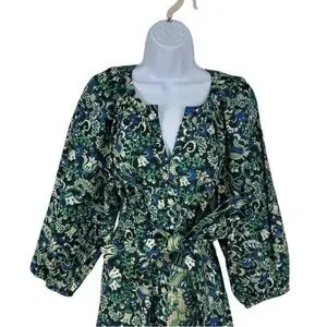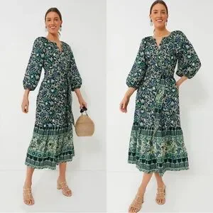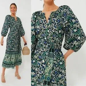 Tuckernuck NEW Batik Floral Lyles Green Blue Puff Sleeve Belted Midi Dress M
