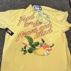 Bright yellow tee with graphic print. Features unique bottle and glass design. Casual and stylish.