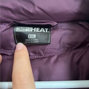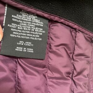 Chic and cozy puffer jacket. Plum front with black sleeves. Ideal for cool weather.