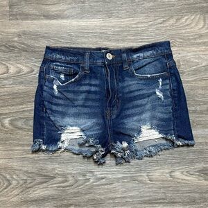 Trendy dark blue jean shorts with frayed edges. Perfect for casual wear.