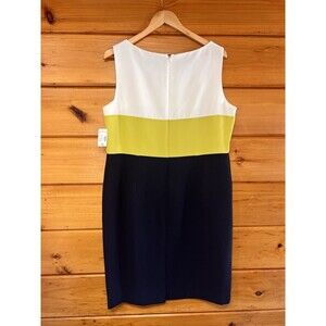 This Jones Studio dress is a chic and sophisticated choice for various occasions. The colorblock design in white, lime green, and navy blue adds a modern touch to the knee-length pencil dress. Featuring a sleeveless style with a round neckline back zip and a zip closure, it is perfect for parties, workwear, or business settings. Made of polyester material, this lined dress in size 16 offers a flattering silhouette for women looking for a stylish and professional outfit.