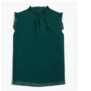 Chic, polished, and effortlessly feminine, this J.Crew Factory smocked neck top is a versatile wardrobe staple with refined texture and structure. Designed in a rich deep green hue, the blouse features a softly smocked neckline that adds subtle interest and an elevated finish. Delicate ruffle detailing at the shoulders enhances the silhouette, while the sleeveless cut keeps it light and wearable. Fully lined for comfort and coverage, this top transitions seamlessly from workdays to weekend plans and pairs beautifully with tailored trousers, skirts, or denim.
