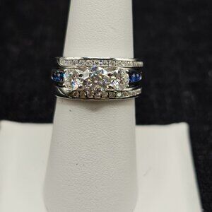Gorgeous Moissanite 3 ring set. The main solitaire also has sapphire stones on the sides. Sterling Silver. Size 8