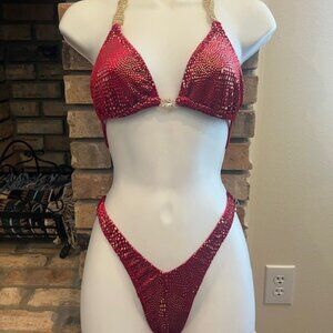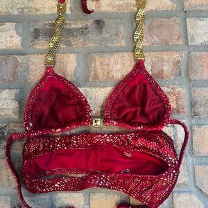 Never Worn on stage!! CCFITWEAR metallic Rasbery Red velvet with a gold metallic print!! and 3 gold colored Crystal Connectors. This suit SPARKLES!! My pics do not do it justice. The top is a sliding triangle with "A"/"B" cups and pockets for pads (none included). The bottom is a stretchy small/medium "V" cut. The back straps have been left long for you to custom adjust to your height. This suit is very well made! Beautiful!