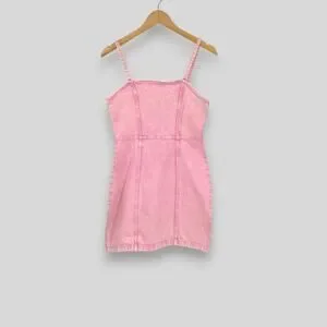 Soft acid washed pink denim strappy mini dress.