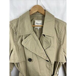 Stylish tan trench coat by Madewell. Features a double-breasted design and waist tie. Ideal for versatile wear.