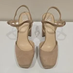 Chic Vince Camuto heels in tan suede. Stylish strap design. Perfect for any occasion. Heels 4.63 inch