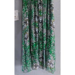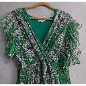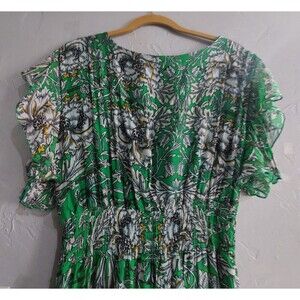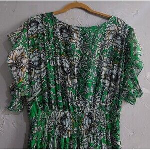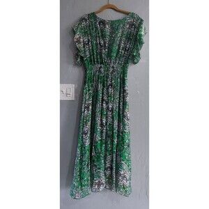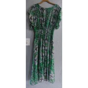 Elegant women's dress, size L, made in Italy, crafted from a soft blend of viscose and silk. It features a vibrant green base with a delicate white floral print, perfect for summer occasions or an elevated daytime look. The dress has a flattering V-neckline and a high elastic waist just below the bust, creating a graceful silhouette. The fluttery short sleeves and flowy maxi length add charm and movement. Lightweight and sophisticated, this is a truly eye - Catching piece ,maxi 16.5 inch of Armp To Armp measurement .