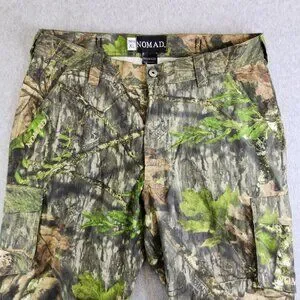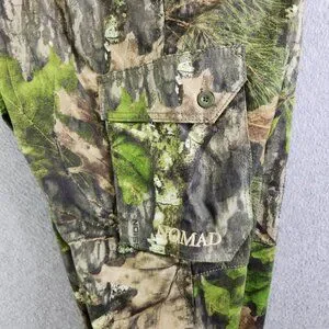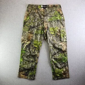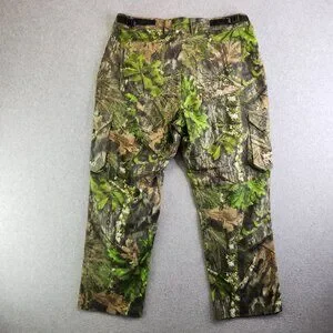 Durable cargo pants with a camouflage pattern. Features multiple pockets. Ideal for outdoor activities.