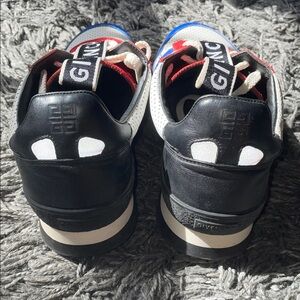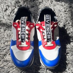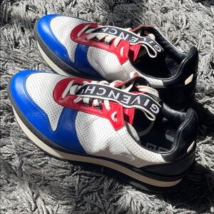 Bold Givenchy sneakers with a mix of white, blue, and red. Perfect for a standout look. Some wear. Size 43 euro/ size 10 us. T3 Runner